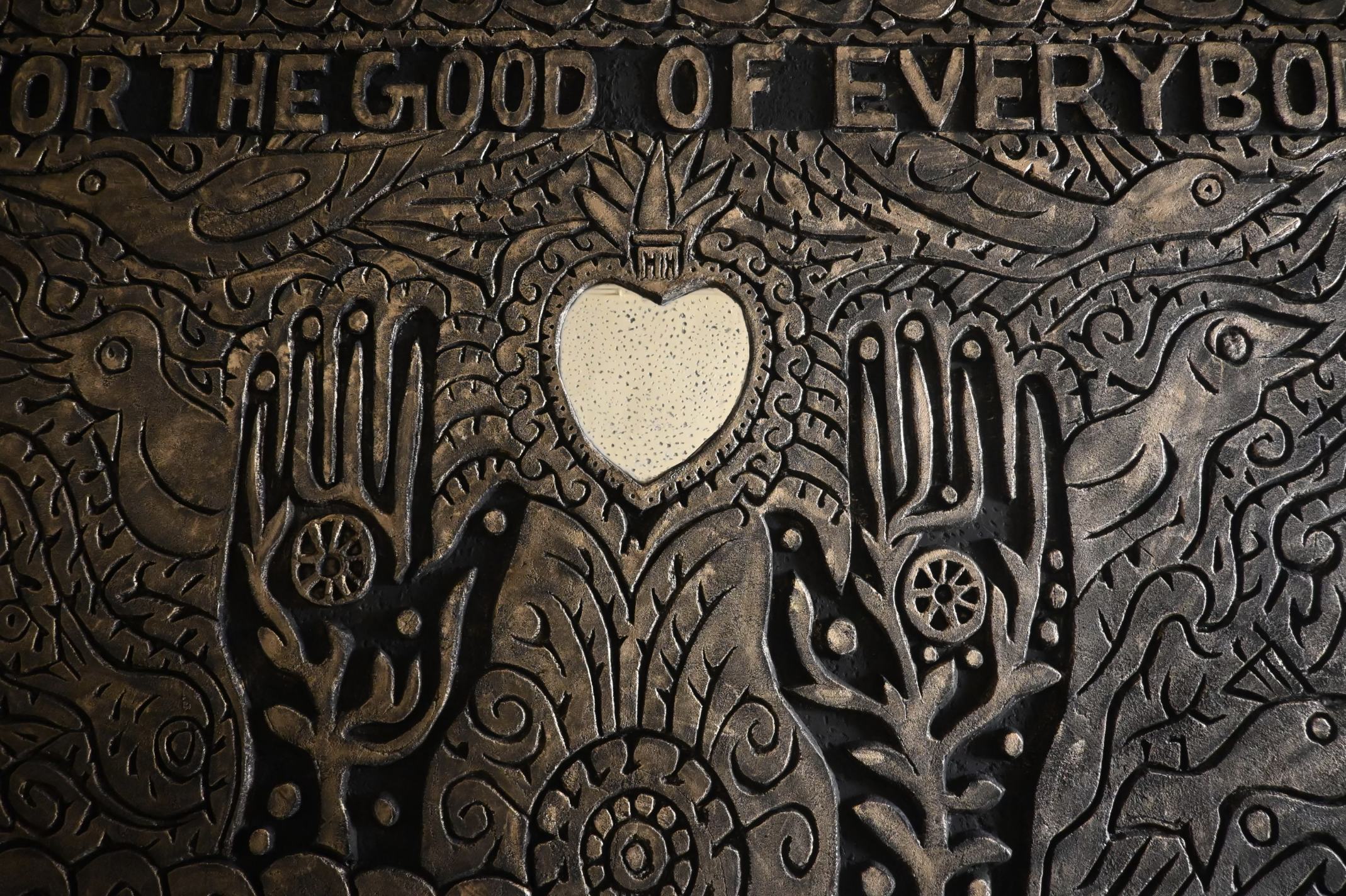 “For the Good of Everybody” Cement Relief Mural, 9’ x 16’, Banaras Hindu University, Varanasi, 2025